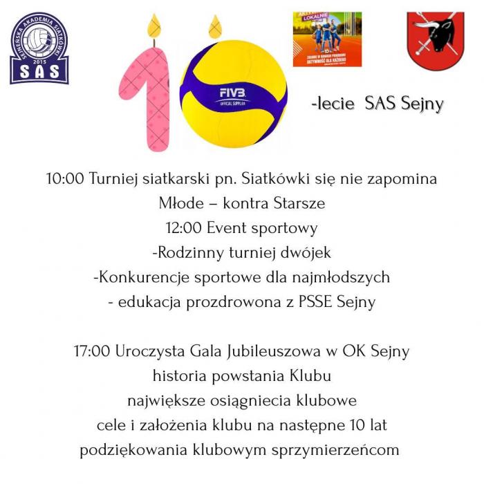 Klub Sportowy 'Sejneńska Akademia Siatkówki' zaprasza zawodniczki i ich rodziców, mieszkańców oraz sympatyków siatkówki na obchody 10-lecia powstania klubu.