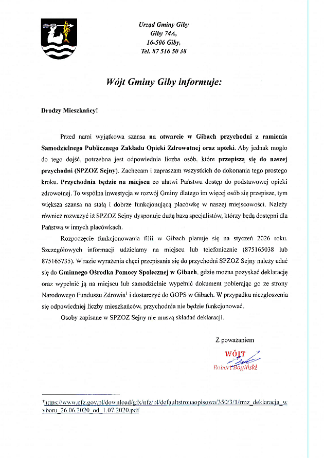 - Rozpoczęcie funkcjonowania filii w Gibach planuje się na styczeń 2026 roku. Szczegółowych informacji udzielamy na miejscu lub telefonicznie (875165038 lub 875165735). W razie wyrażenia chęci przepisania się do przychodni SPZOZ Sejny należy udać się do Gminnego Ośrodka Pomocy Społecznej w Gibach, gdzie można pozyskać deklarację oraz wypełnić ją na miejscu lub samodzielnie wypełnić dokument pobierając go ze strony Narodowego Funduszu Zdrowiał i dostarczyć do GOPS w Gibach. W razie problemów, służymy pomocą. Osoby zapisane w SPZOZ Sejny nie muszą składać deklaracji.