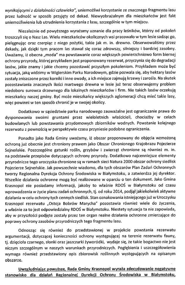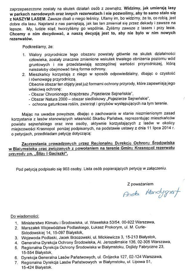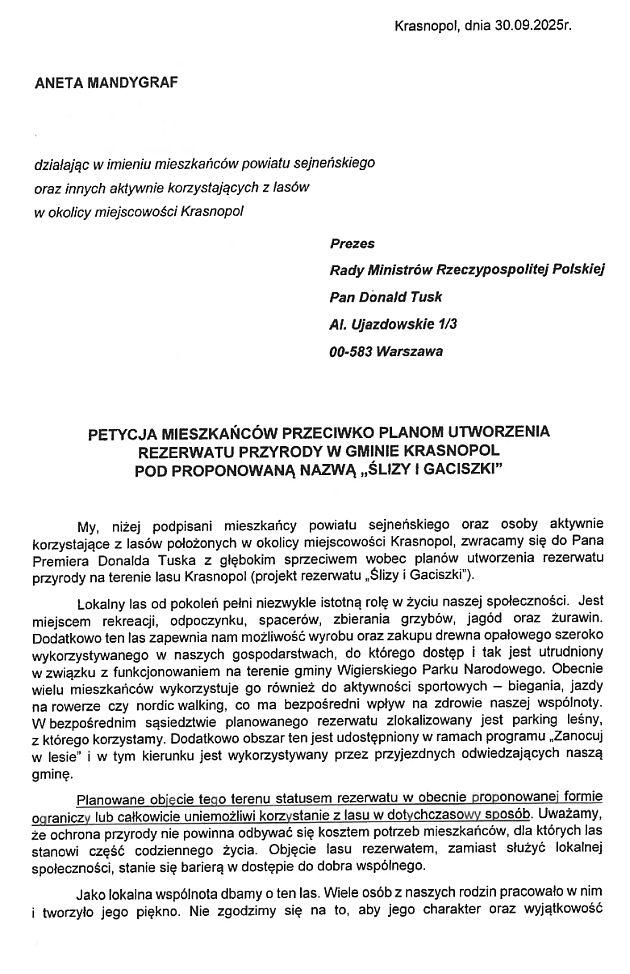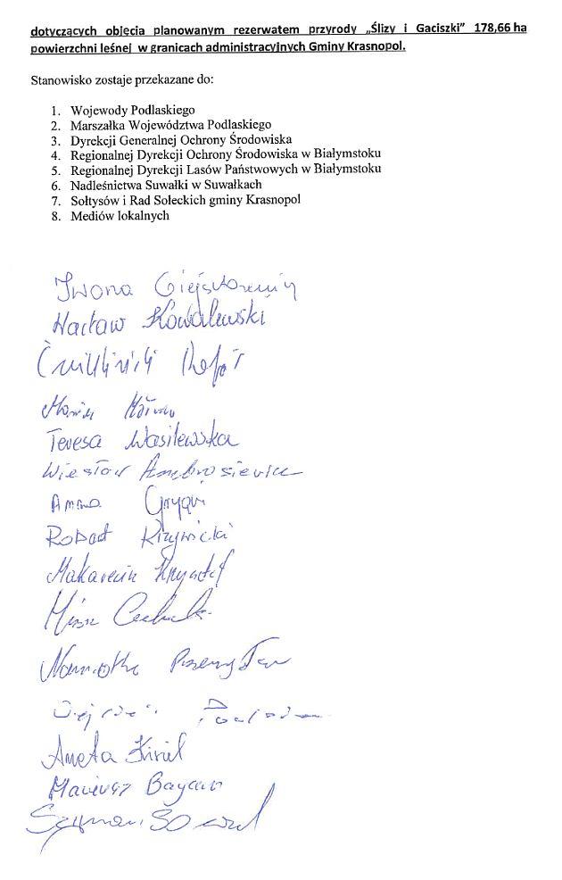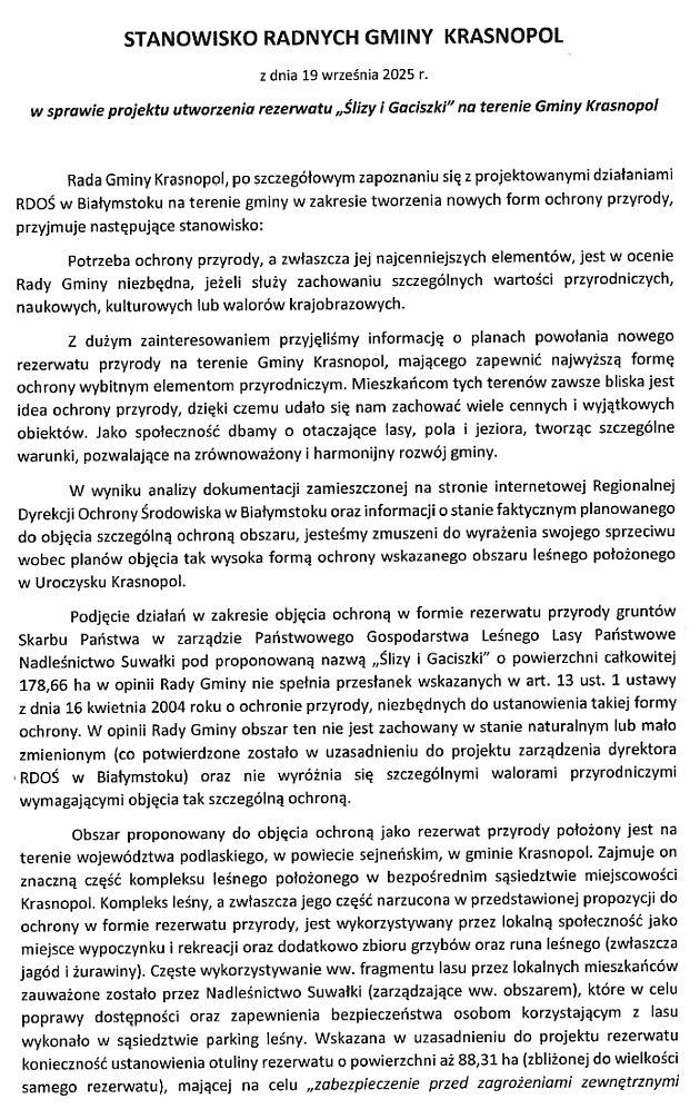 Przeciwko zamiarom służb ochrony przyrody wystąpiły osoby, które podpisały się pod petycją do premiera Tuska, przekazaną do wiadomości Ministerstwa Klimatu, marszałka i wojewody, Lasów Państwowych, GDOŚ i RDOŚ. Autorką pisma, które sygnowały 903 osoby, jest Aneta Mandygraf - inspektor ds. rolnictwa, ochrony środowiska i funduszy unijnych Urzędu Gminy Krasnopol. Rada gminy Krasnopol również uchwaliła piętnastoma głosami stanowisko przeciwne tworzeniu rezerwatu Ślizy i Gaciszki. Argumenty przeciwko to niemożność czerpania korzyści z lasu i ograniczenia dla mieszkańców. Kopie obu dokumentów - poniżej.