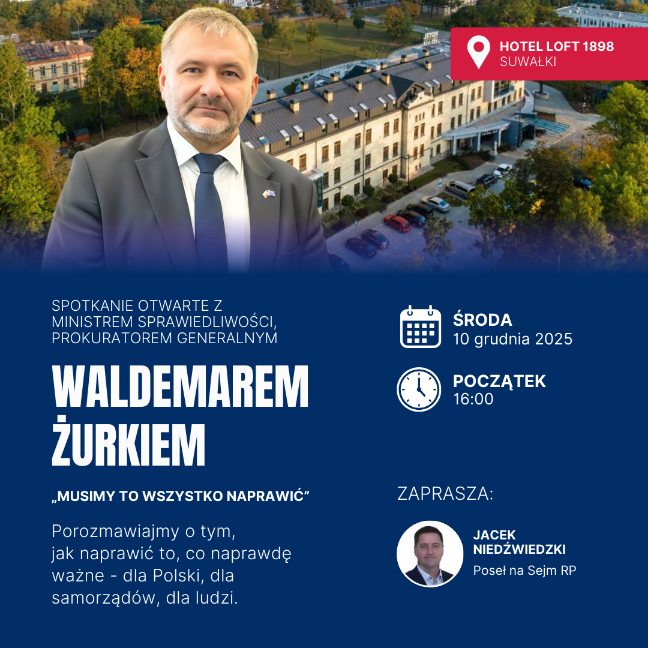 Poseł Jacek Niedźwiedzki zaprasza na spotkanie z ministrem, które odbędzie się we środę 10 grudnia, o godzinie 16:00 w Hotelu Loft w Suwałkach.